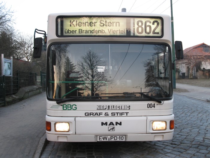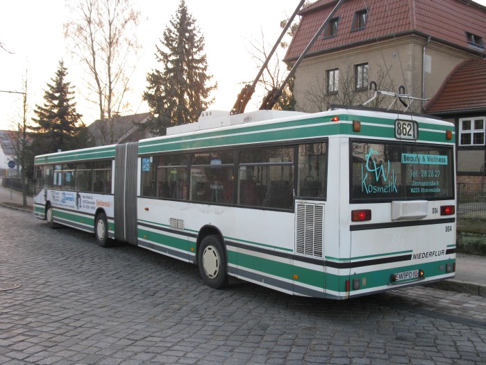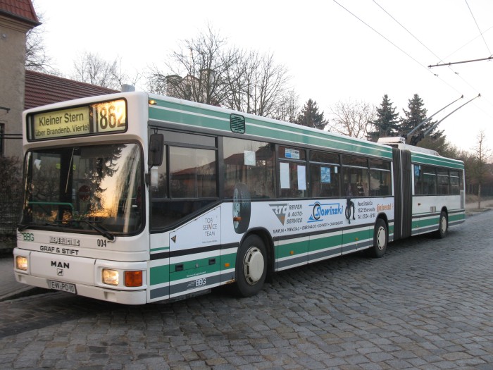 Die Fotos zeigen den Gelenkobus Nr. 004 vom österreichischen Typ ÖAF Gräf & Stift NGE 152 M17 auf der Obus-Linie 862 an der Endhaltestelle Ostend.